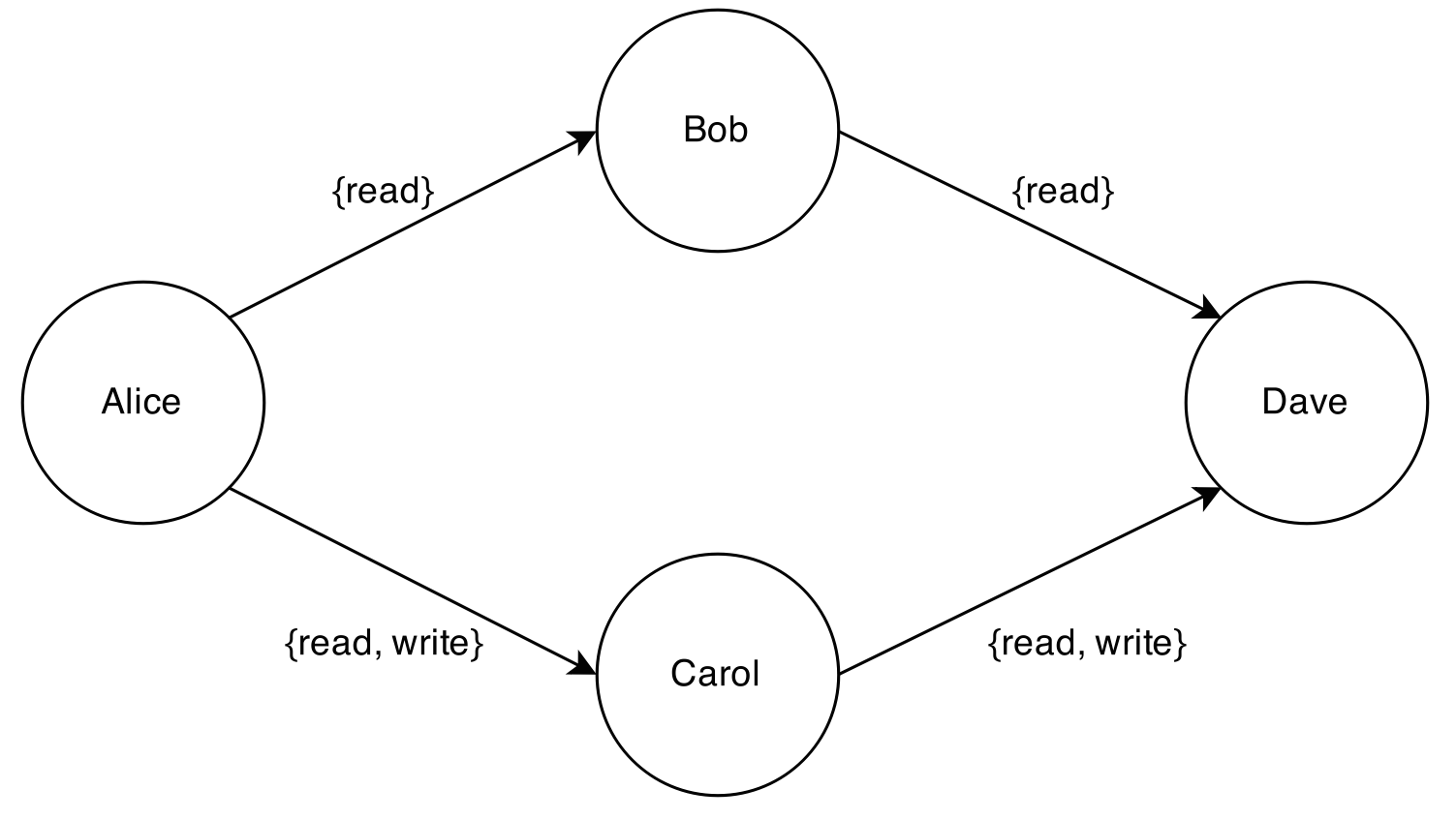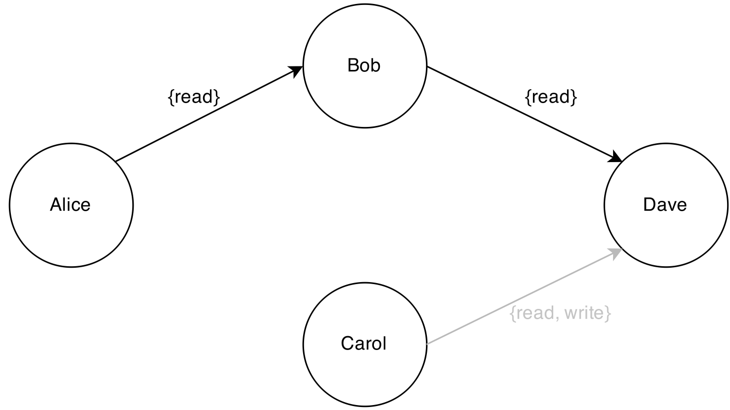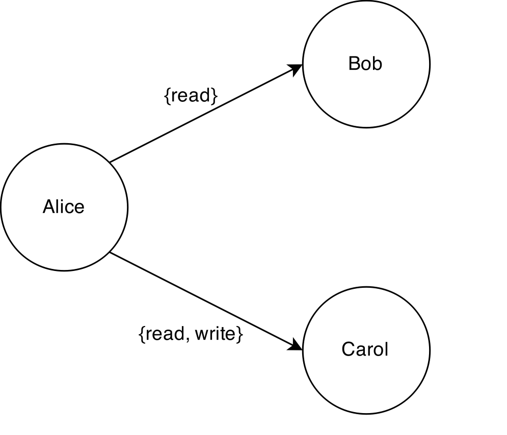 Traditional access control is accomplished using “access control lists” (ACLs), in which a document owner (Alice) maintains an ACL for the document specifying exactly who has access (Bob and Carol). In many systems, Bob and Carol cannot directly add a new person (Dave) to this ACL – they must ask Alice to do it. Usually, this is treated as a security “feature”.